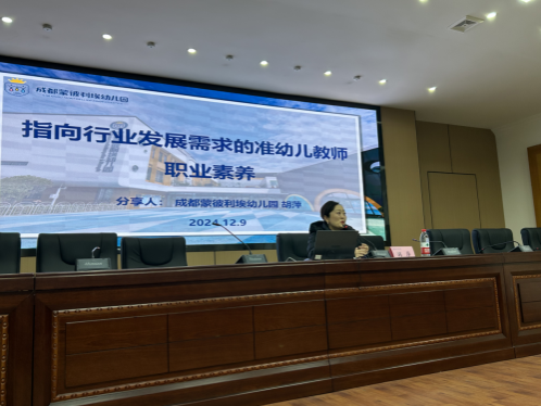 上午9点,胡萍在弘毅楼704会议室开展了题为“指向行业发展需求的准幼儿教师职业素养”的专题讲座,参会人员有教育科学学院副院长马艺丹、学前教育系主任余祥、乐山师范学院附属幼儿园园长李莉、部分幼儿园教师代表以及学前教育专业学生。讲座由马艺丹主持。